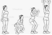 Clean and Press 8 to 12 Repetitions Holding light dumbbells in each hand, squat down. Then as your stand up, raise the dumbbells above your head. Variation : Reverse the above. ie. As you squat downwards, simultaneously raise the dumbbells above your head. |