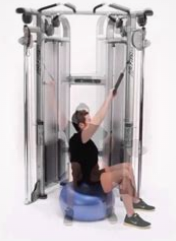 Lat Pulldowns Sit on a fitball positioned to one side opposite to the hand holding a single handed cable grip. The start point should be above your head level. Pull the handle down to your side – level with your chest. Advanced: Raise one leg off the ground The point of this exercise is to build full range back into an impaired muscle. Heavy weights are not helpful until this range is recovered. In time extra weight can be added. |